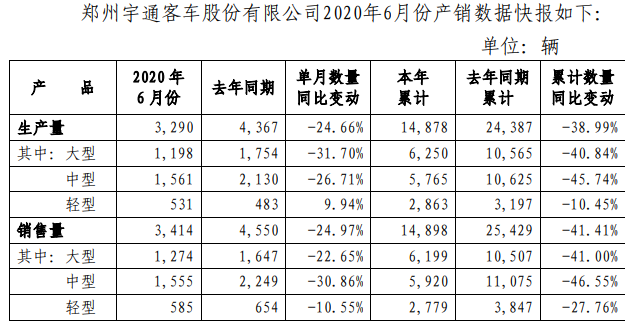 7月4日,郑州宇通客车股份有限公司发布2020年6月份产销数据快报。数据显示,销量方面,6月份,宇通客车实现销售3414辆,同比下降24.97%。其中,大型客车销量为1274辆,同比下降22.65%;中型客车销量为1555辆,同比下降30.86%;轻型客车销量为585辆,同比下降10.55%。