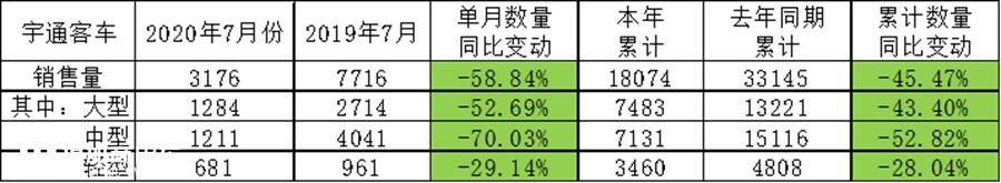 8月4日,行业龙头企业宇通客车率先公布2020年7月份产销数据快报(如下表),无论是当月销量/累计总销量、还是分车型的销量都是全线下跌,其中宇通客车最强势的中型客车当月下滑了70%;今年1~7月相比去年同期累计下滑仍然还有45.5%,大、中型客车都有40%以上的跌幅,几乎是腰斩的状态,龙头企业尚且如此,整个行业的情形就可见一斑了!