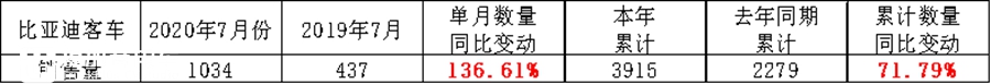 8月7日,比亚迪汽车公布了2020年7月份产销数据快报(客车销量如下表,比亚迪是集团统一公布,客车未细分车型),比亚迪的客车销量可谓是今年行业整体低迷情况下的一股“清流”了,7月份当月同比大增136%,1~7月累计相比去年同期也是增长72%;众所周知,比亚迪只有纯电动客车,相比宇通客车、金龙、中通等企业都有传统(燃油/燃气)和新能源(纯电动/插电式/燃料电池)的产品,比亚迪客车的产品相对单一(纯电动客车90%的市场在公交领域),能取得如此的成绩也实属不易。