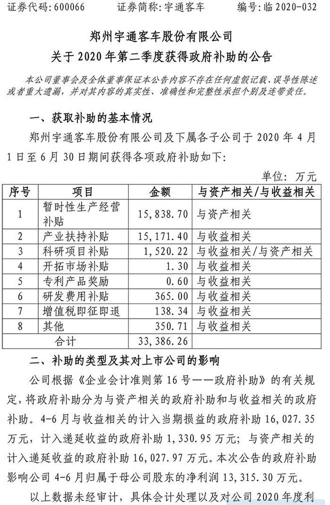 8月25日,宇通客车发布公告称,公司及下属各子公司于2020年4月1日至6月30日期间获得各项政府补助合计3.34亿元。