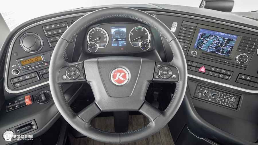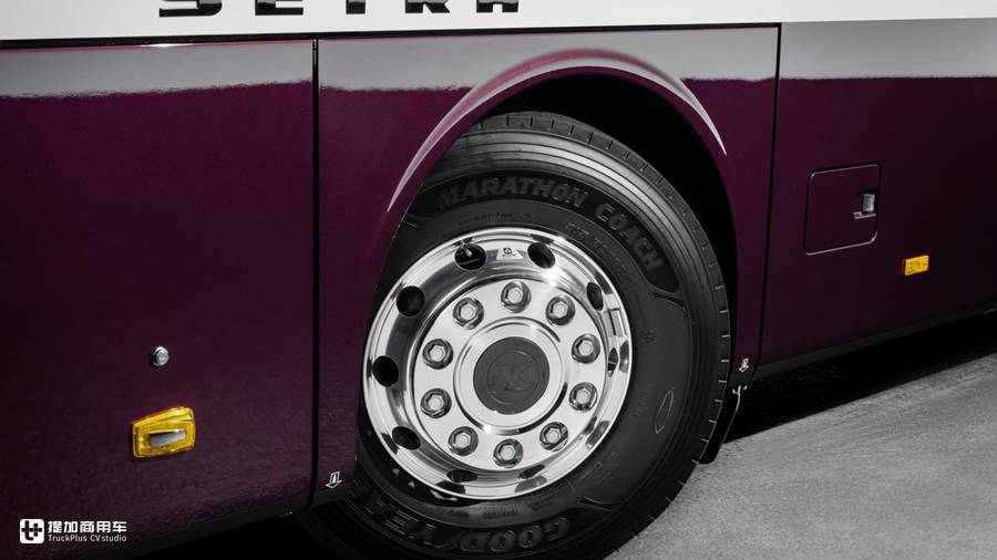 这款车型标配镁铝品牌的铝合金轮圈,外侧的防风罩中间带有黑色字母K标识,以此作为对该品牌豪华巴士的创始人Karl Kässbohrerr崇高纪念。