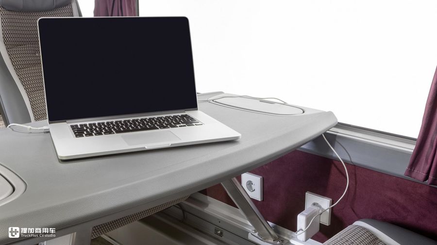 上层、下层部分座椅可以选装对称布局,中间的置物台可以放置随车物品,舒适度极高。
