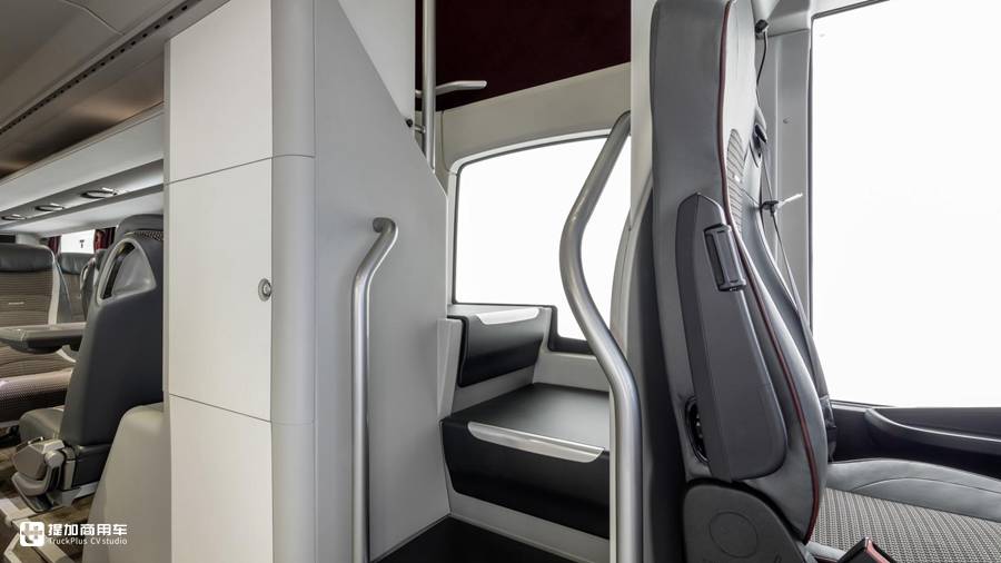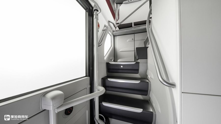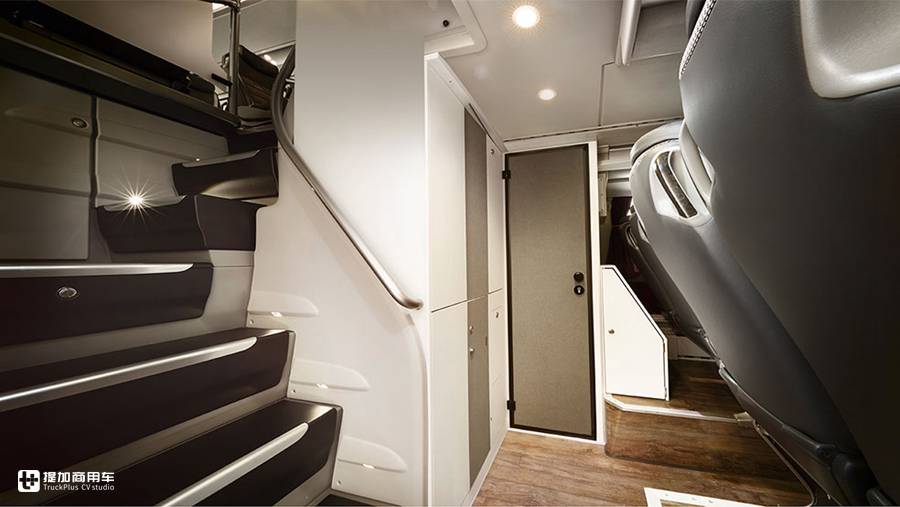 上层楼梯设计在驾驶座椅后方位置,采用了紧凑旋转设计,宽体台阶不会让乘客上下车辆感觉到高耸。