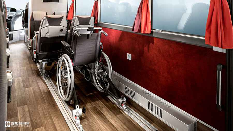 这款车的下层右侧的四排座椅可以替换为两个轮椅预留空间,为老人、残疾人日常乘车提供极佳便利。