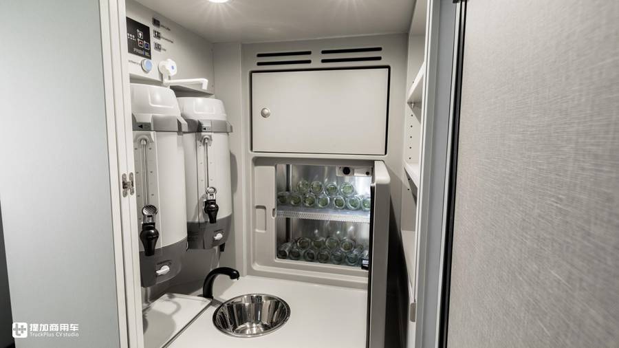 与后排车门正对的便是微型厨房,侧面微型储物格可以放置饮料、咖啡等物品,与此同时微型消毒柜也是实用性的极致体现。