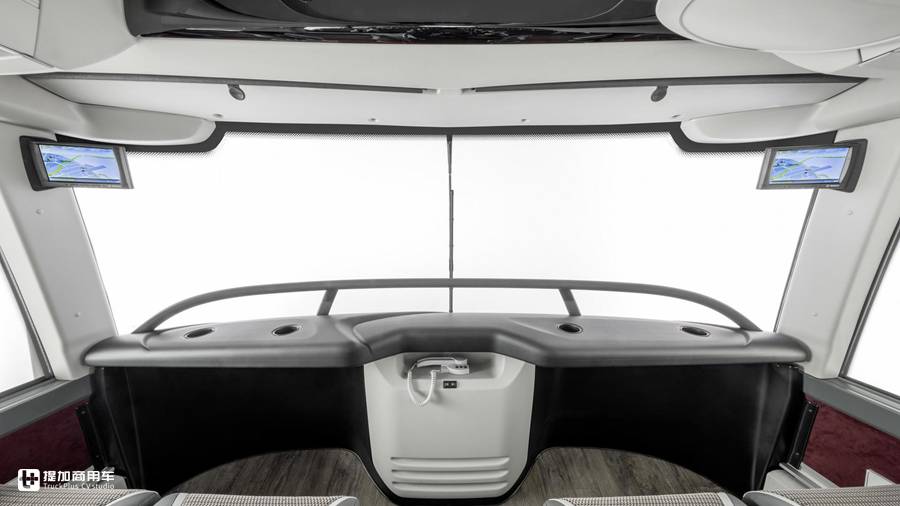 上层前部设有宽敞的乘坐空间,弧形设计提供更多腿部空间,前部可以设有放置水杯的置物格,整体舒适性极高。