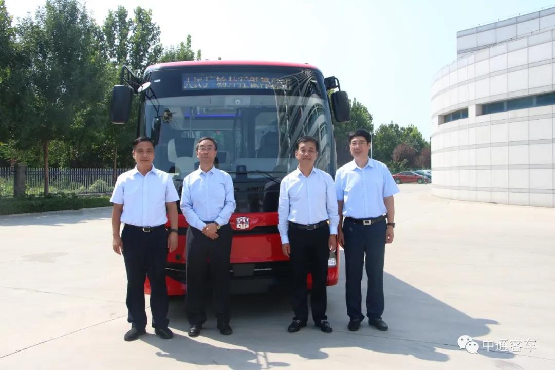 中通客车党委书记、董事长宓保伦 山东交运集团董事长吴宗昌、青岛公交集团董事长邢昌友 、聊城交运集团董事长王红岩共同为中通睿通V60揭幕