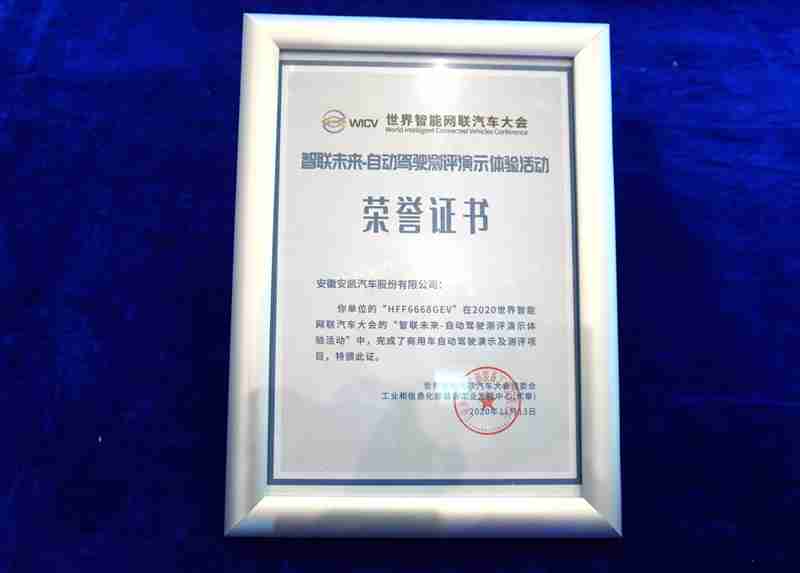 同时在当天的2020世界智能网联汽车大会闭幕式上,工业和信息化部领导为安凯客车颁发自动驾驶测评演示荣誉证书。