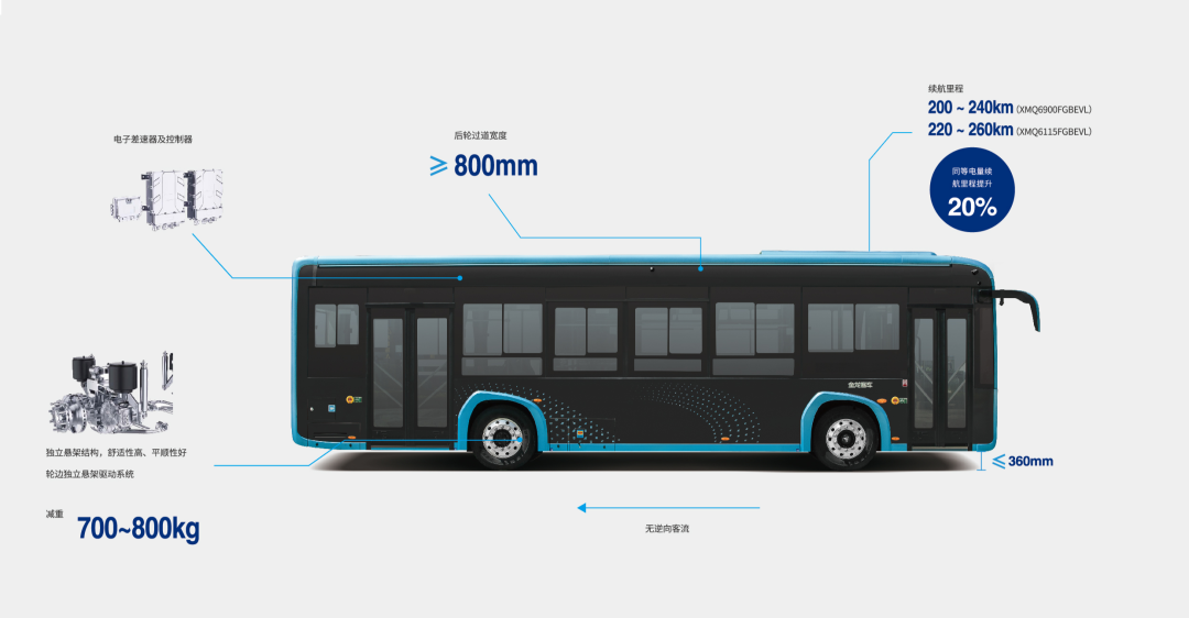 地铁巴士是金龙客车轮边驱动产品的集大成之作,整车轻量化是地铁巴士的一大亮点,采用了金龙客车第三代轮边驱动系统结构,与第四代分布式驱动控制策略,性能优异,实现整车减重700公斤以上。