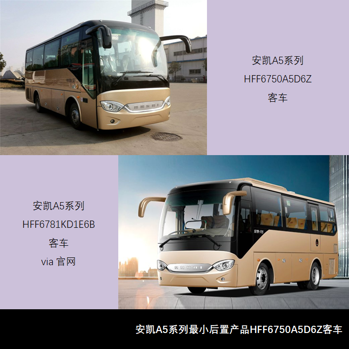 安凯HFF6750A5D6Z则是以A5系列平台为基础,下沿至后置ICE动力的7.5米长度下限,最大载客31+1人,与同级别的前置中巴形成良好衔接。该车轴距3.5米,有底置行李舱,采用前3后4板簧悬挂,玉柴YCS04160-68国六柴油机,不过该款发动机更多应用于中巴和校车产品,安凯该车的具体表现有待观察。