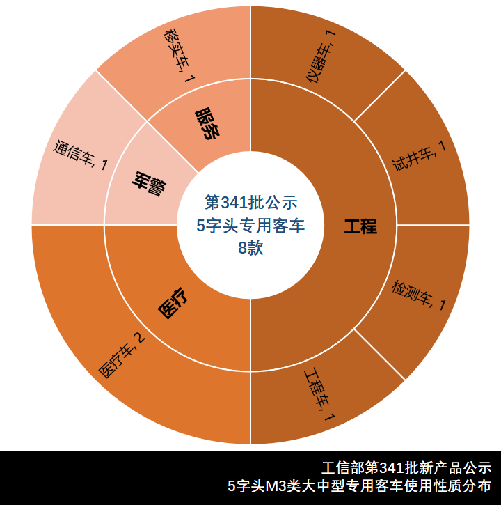 最后来看5字头专用客车,本批总数8款大幅减少,显然是由于春节假期临近降低了行业客户的采购欲望。具体看:工程用途4款为本批最大使用性质,南阳二机的ES5142XYQ仪器车和濮阳龙欣专汽的LGC5081TSJ试井车均用于油田作业。医疗用途2款,军警和商业服务用途均为1款。