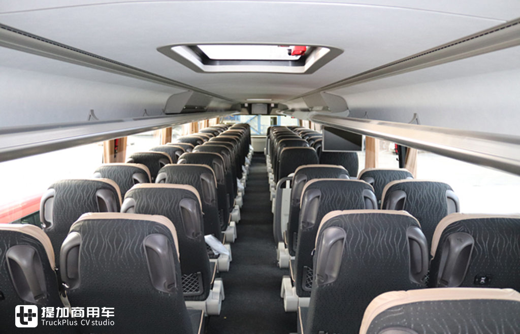 上层客舱有效垂直高度为1724mm,座椅方面采用了主流的2+2布局,可以提供绒布以及真皮材质的面料,靠背采用了舒适性极佳的仿生学设计,长距离乘坐舒适性更强。