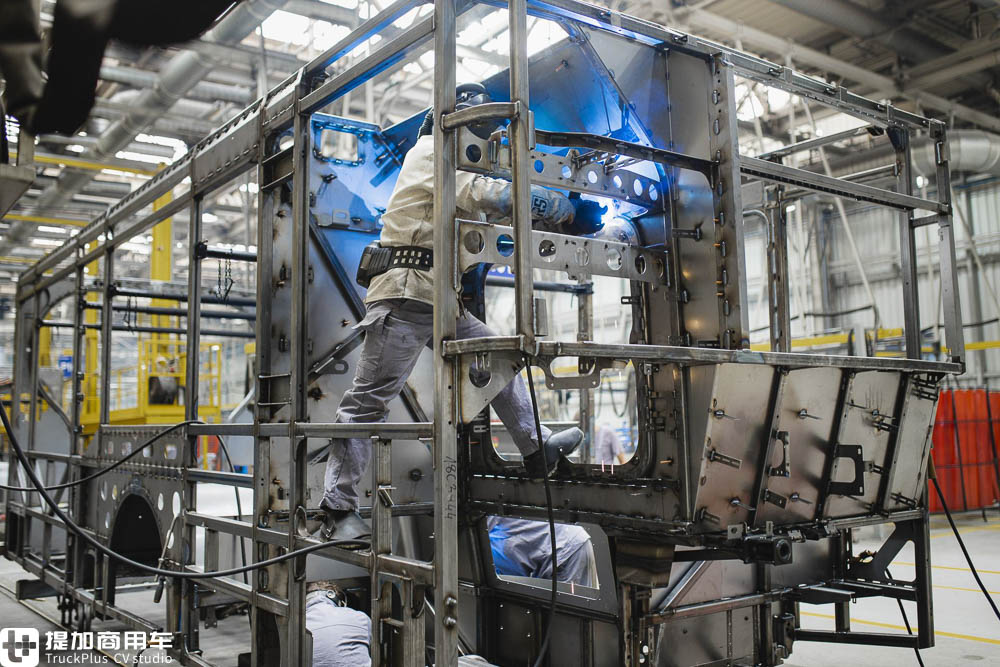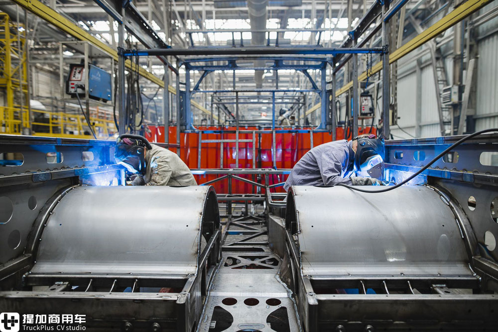 焊接完成之后,整个车架会被抬起,由布置在屋顶的起重机吊至整车电泳车间,完成整体的电泳防腐工作。你还能看到,轮罩内已经留出了悬挂的安装位置,万事俱备,只欠东风。