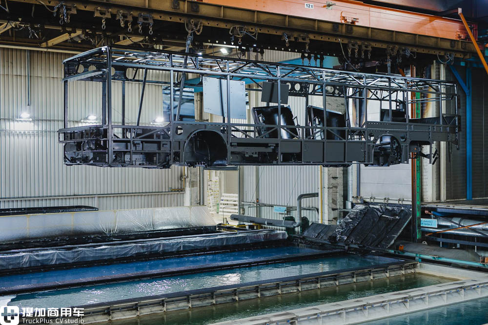 完成防腐后的车架变了个颜色。整车电泳是当今车辆生产中至关重要的环节,小到小电驴,大到超长的铰接客车,电泳操作是必不可少的。经过电泳后的车体具有极强的防腐性能,大大延长车辆的生命周期。在国内,宇通最先建立了整车电泳车间,并拥有一整套的Y.E.S宇通电泳标准。