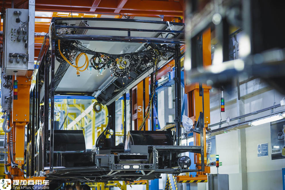电泳完成后的车架返回生产线,接下来安装车辆的整车线路,最后安装内饰板,对接铰接棚。