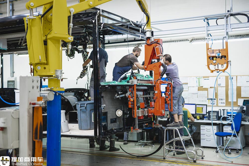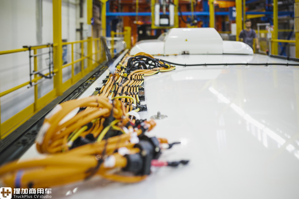 正如之前所言,车辆的电池组安放在车顶,需要借助起重机将重达数吨的电池吊起,最后固定在车顶上。