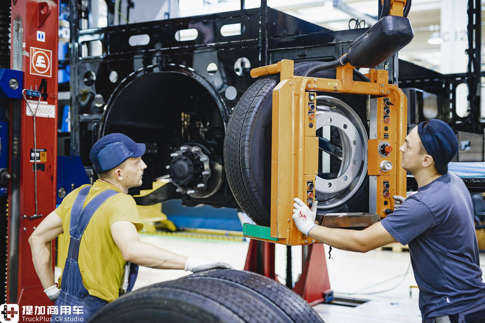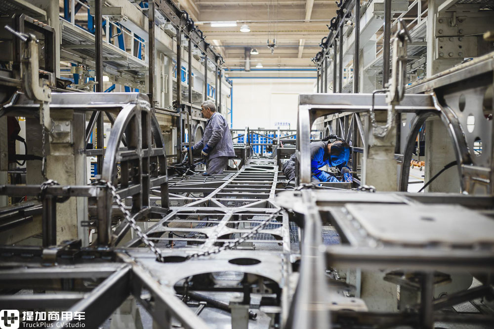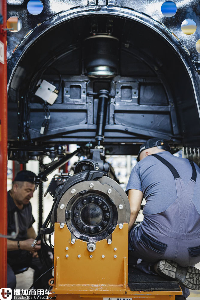 之后,工作人员开始将车桥对接到车架上。在图中,用于减震的空气悬挂气囊清晰可见。