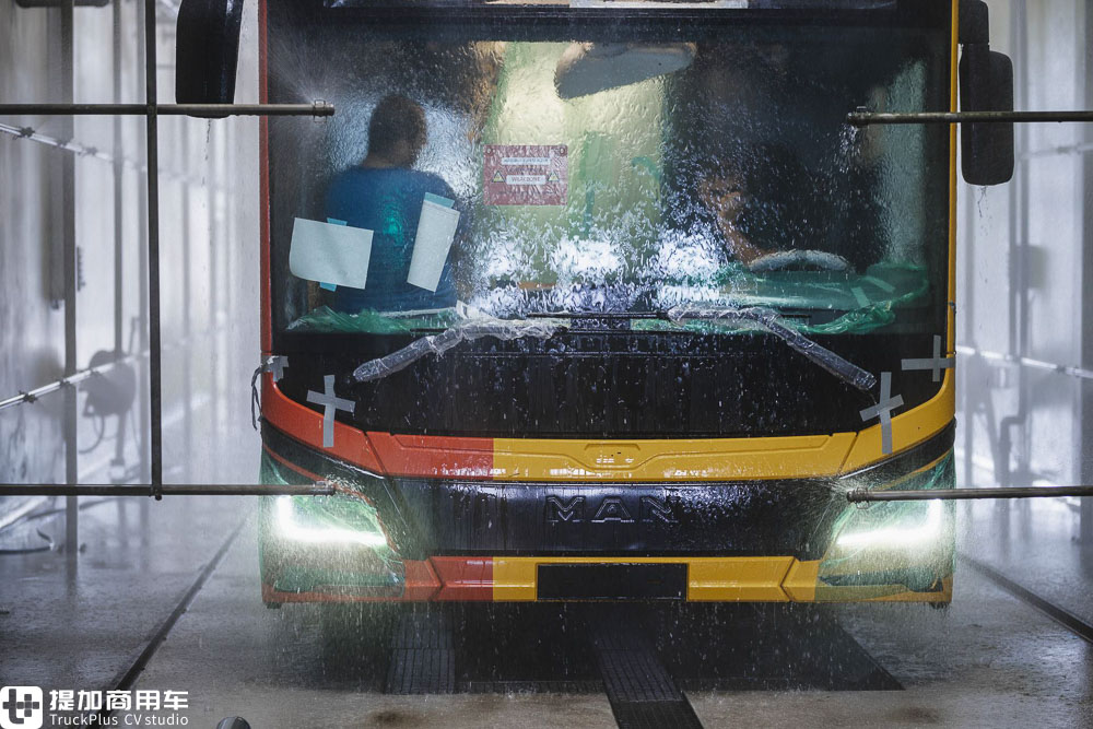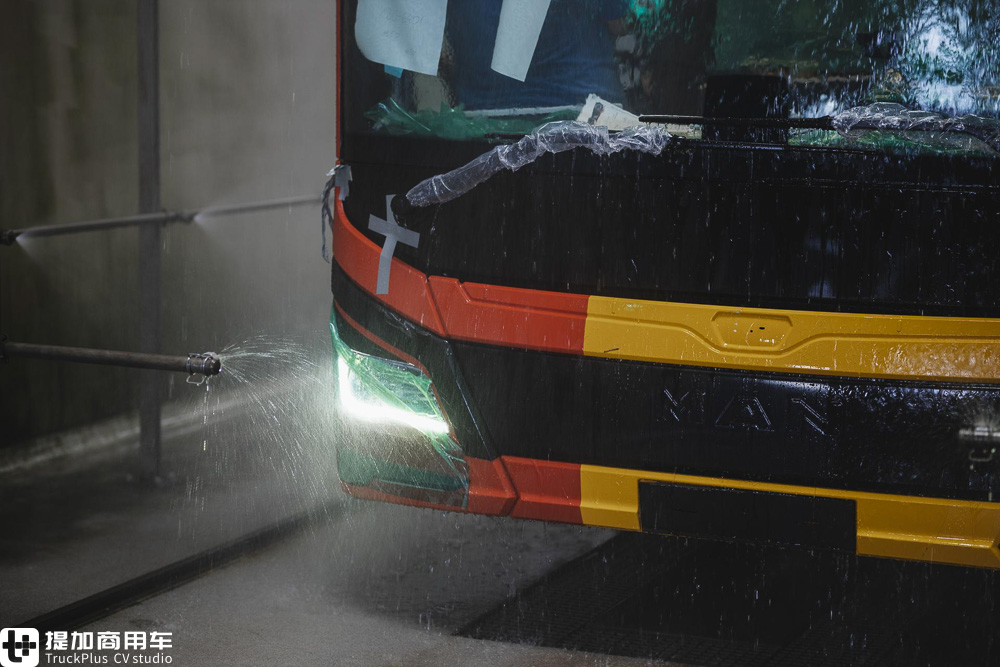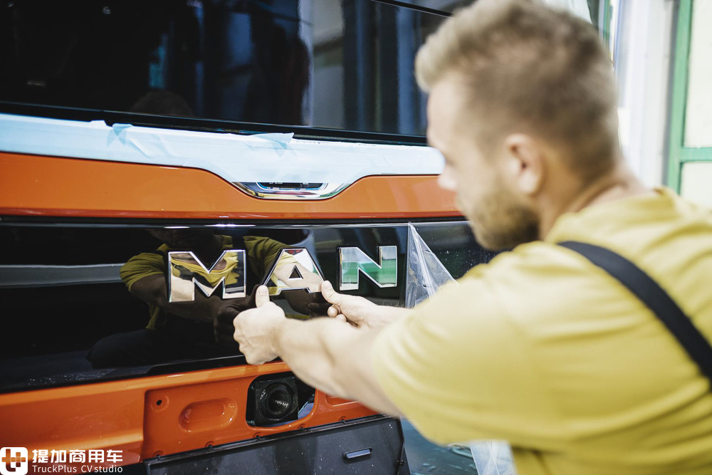 进行完雨淋测试的车辆就能够撕掉车身的贴膜,贴上MAN的镀铬标志,安装各处的装饰组件了。