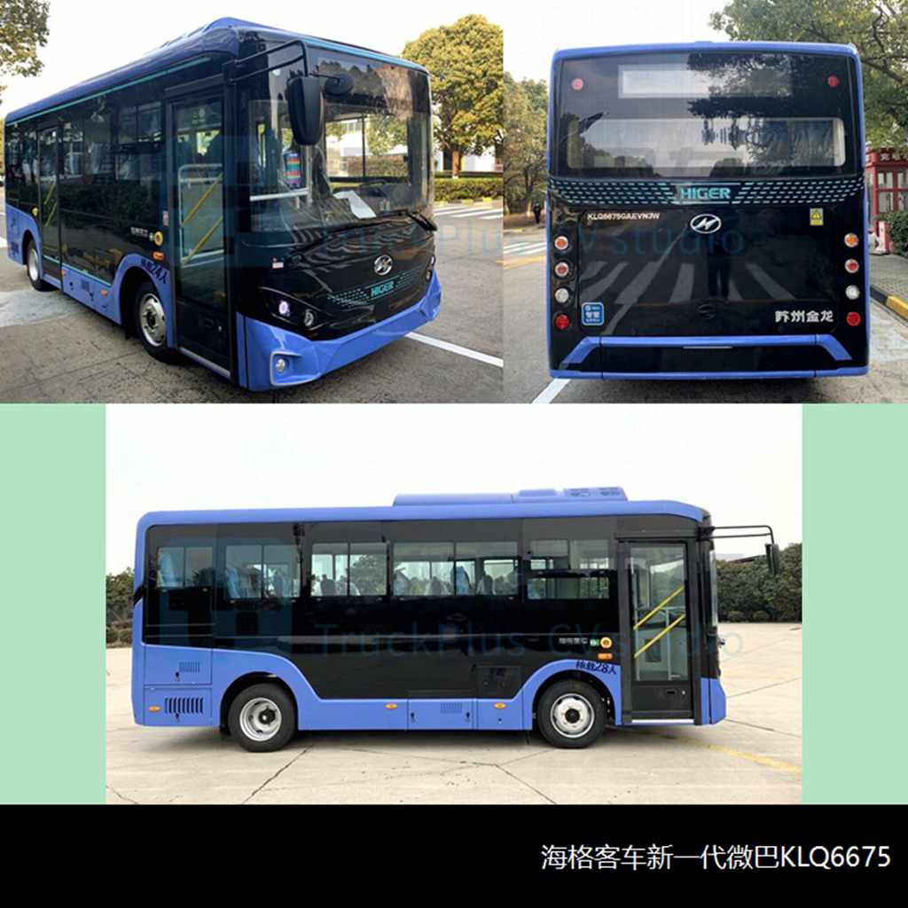 金龙系的海格客车本批申报了KLQ6675GAEVN3W纯电动城市客车,也是其在金龙微巴(两种造型)和海格BH系(较为罕见)之后的最新一代微循环公交(不计清源系列智能中巴,结构有本质差异)。该车采用全新造型,前后围小圆灯配合前后贯通式的底裙边造型是显著特点,异形轮眉、舱门以及乘客门构成完整的侧围轮廓。该车全长6.75米、宽2.34米、轴距3.45米,属于比8米级中型公交“小一号”的产品,符合轻型微循环公交的定位。该车GVW=9.5吨、整备质量6.1/6.4吨,可选空气悬挂或前3后4板簧悬挂,可选右侧单门+左侧应急门结构,额定载客24-28人、未设置站立区(型号尾缀中的W即此意),搭载宁德时代LFP动力电池,苏州金龙自用160kW驱动系统。