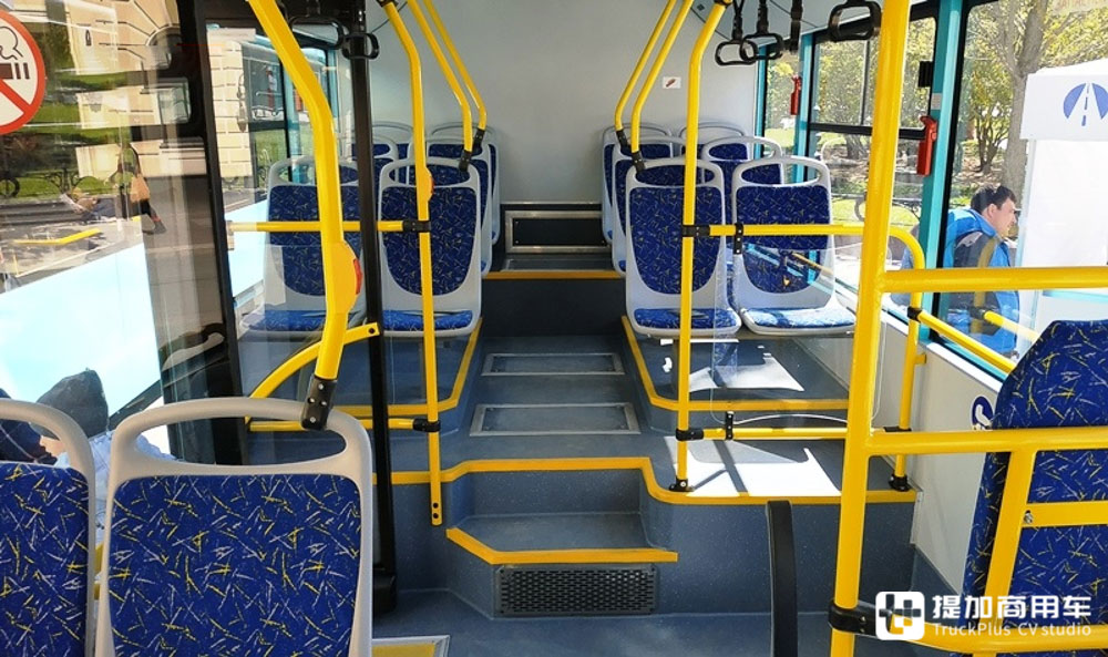 内部的布局是半低地板设计,封尾,后山下容纳了发动机以及LNG气瓶等设备。鲜黄色的扶手虽然提升了提示效果,但是也显得有些视觉疲劳。