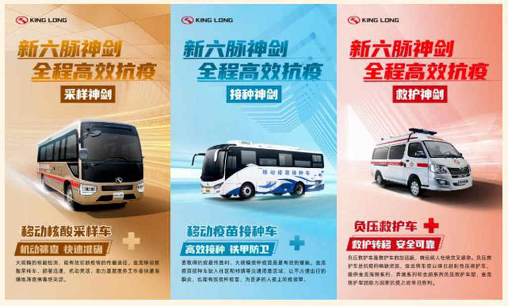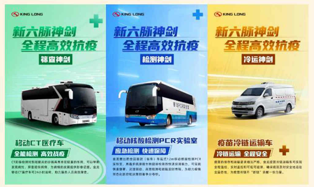 新冠疫情发生之后,金龙自主研发的“疫苗冷链车、疫苗接种车、核酸采样车、核酸检测车、负压救护车和移动CT医疗车”全套抗疫车型,从疫苗冷链、疫苗接种、核酸采样,再到核酸检测、患者负压运输、CT检测,涵盖六大板块的移动医院解决方案,高效助力新冠疫情防控的每个环节。