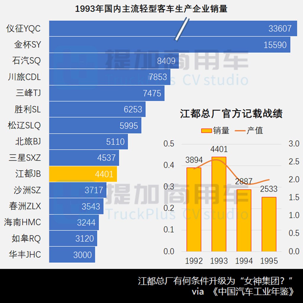 根据1993-1996年《中国汽车工业年鉴》记载,1993年江都总厂的主要企业指标均达历史最佳水平,全年销售4401辆、工业总产值2.51亿元,职工人数也首次突破千人大关、达到1125人。而根据同年国内主流轻型客车企业销量排行可知,江都总厂已进入TOP10,与彼时如日中天的广东三星集团SXZ不相上下,且领先于尚未形成“牡丹集团”的张家港民营系企业,而身前则是沈阳金杯SY、川旅华西CDL、天津三峰TJ、北旅BJ等鼎鼎大名的规模性企业——本次的榜单第十位可谓含金量十足。1993年,江都总厂被国务院发展研究中心、国家统计局评为“中国行业最佳经济效益工业企业”第11名。可能是“学而优则仕”,对规模经济的不断追求促成了集团化运作的必然发生,尽管这在90年代属于流行之风,江都总厂也最终未能免俗变身为“女神集团”。