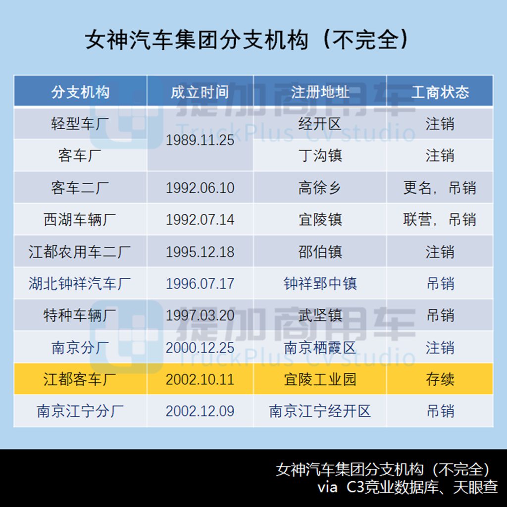 90年代中后期,由于国际国内市场的急骤变化,加之新产品开发不成功等因素,女神集团在短暂巅峰期后也迅速走向下坡路。可俗话说“瘦死的骆驼比马大”,此前江都总厂和女神集团在辉煌时期也曾留下若干分支机构,尽管承担不同的角色与定位,始终是维系江都女神系存在的重要一份子。以1989年11月25日注册成立江都汽车总厂时为例,女神客改厂的新/老厂区分别注册了非独立法人机构的轻型车厂和客车厂,而位于高徐乡的原琼花客装厂则在1992年以客车二厂的名义注册,以外还有联营的西湖车辆厂(也称为宜陵客车厂)、邵伯镇的农用车二厂、武坚镇的特种车厂,甚至1996年还在湖北省成立过钟祥客车厂和相关营运公司。进入新世纪后,女神集团还在南京成立过两家分厂,但也都以注销或吊销结尾。未曾想到的是,2002年10月11日成立的江苏女神汽车集团江都客车厂则成为唯一坚守至今的分支企业,并成为江都女神血脉的真正继承人——而这又有何等插曲?且听下文分解。(未完待续)