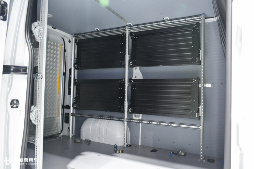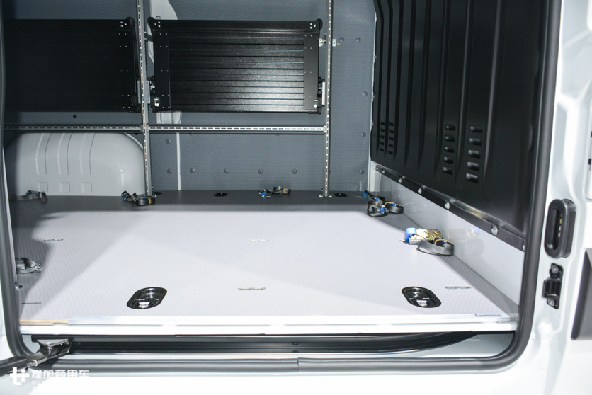 车辆右侧有一个侧滑门,后面两扇对开门都可以卸货。木地板和预留的货物固定锚点便于后期使用中装载货物,驾驶员区域和货运区完全隔离。