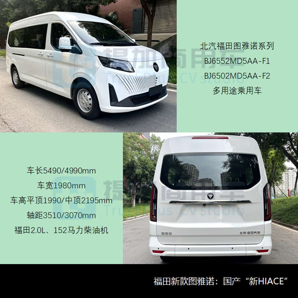 北汽福田本批申报了“国产新HIACE”的M1类小轻客新品,官方仍归属于图雅诺系列,但根据习惯或将给予尾缀代号以示区别,包括长轴款BJ6552MD5AA-F1和短轴款BJ6502MD5AA-F2两款多用途乘用车。