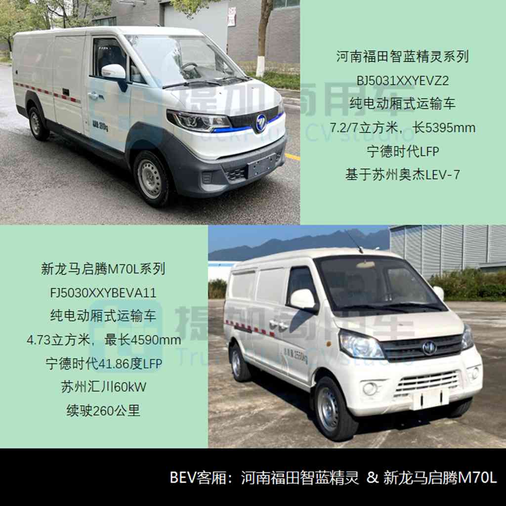 - 福建新龙马申报了启腾M70L系列FJ5030XXYBEVA11纯电动厢式运输车,实际是利用原有微面平台改制而来,通过调整外饰件尺寸以及“油改电”,越过4500mm上限、最大可达4590mm,搭载宁德时代41.86度LFP动力电池,苏州汇川60kW电驱系统,续驶260公里。该车宽仍为1620mm的微面规格,货箱容积4.73立方米,与同长度级别的长安睿行M60相比稍有逊色,可知传统微面平台与泛轻客类(欧系/日系/自主或客厢车)仍有空间上的本质差异,而对各方量级的追求也将成为LCV产品组合与布局的主要依据。