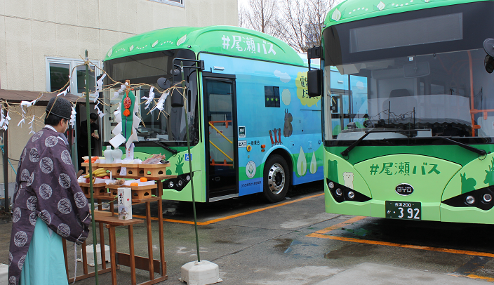 一月的日本会津,大雪纷飞。雪后初霁,会津乘合自动车株式会社停车场内,神职人员虔诚地进行祈福仪式,穿过他们望去,喷绘着“卡哇伊”车身的比亚迪电动巴士一字排开,吸引着众人的目光。