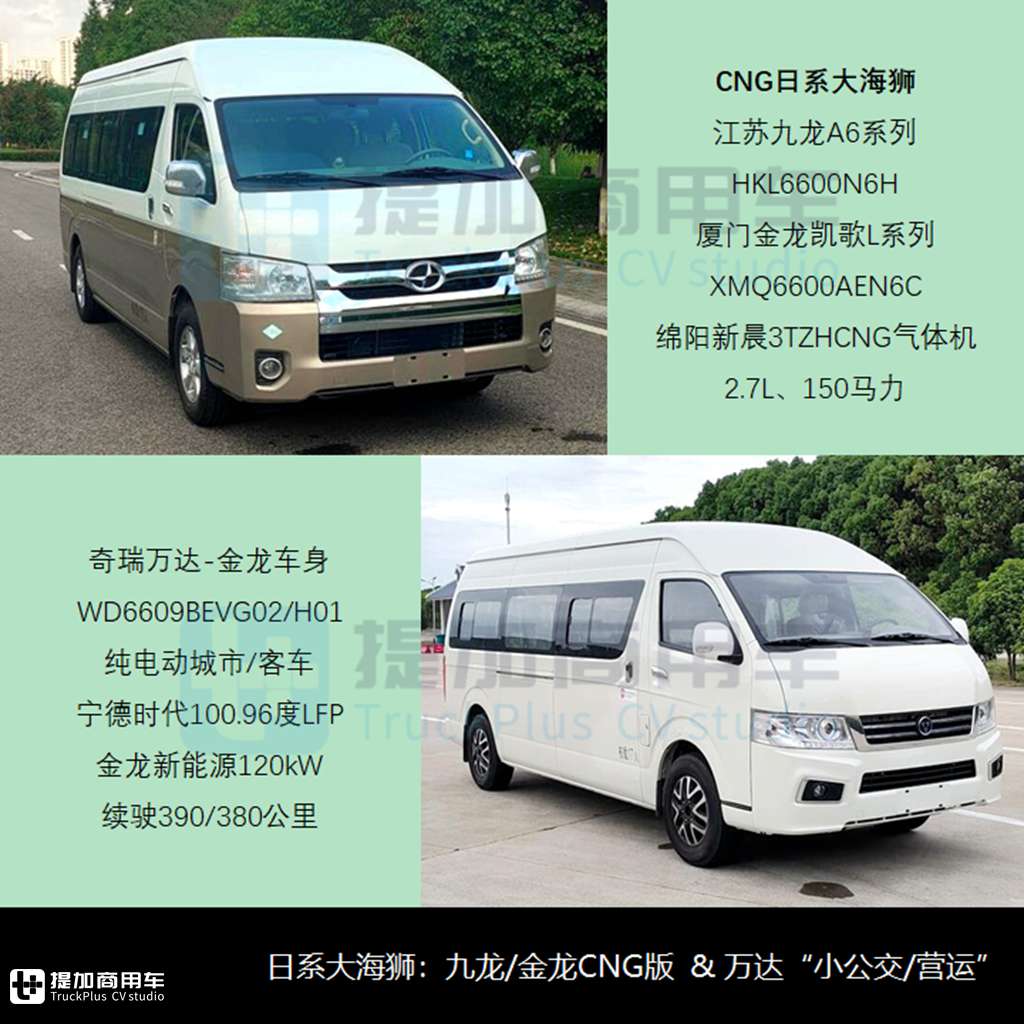 - 继江淮星锐完成欧系轻客的“气化”后,本批也出现了两款采用CNG动力的日系海狮轻客、且采用相同动力链,可知国六时代的燃气化工作已向全系商用车铺开。本批两款新品为:厦门金龙凯歌L系列XMQ6600AEN6C以及江苏九龙A6系列HKL6600N6H客车,均采用绵阳新晨2.7L、150马力的3TZHCNG气体机,最高限速100km/h,面向“小营运”市场,额定载客分别为11-17座和10-17座。以上两车均采用宽体大海狮规格,同为超过2.2米的高顶车身、轴距3720mm,不同处也很明显:金龙款车长5998mm、宽1885mm,九龙款则为5990和1880mm,二者前后轮距稍有不同,前后悬分别为1168/1110mm和1190/1080mm,另从车身亦可知架构完全不同,分别代表了当下日系轻客的两款主流平台。