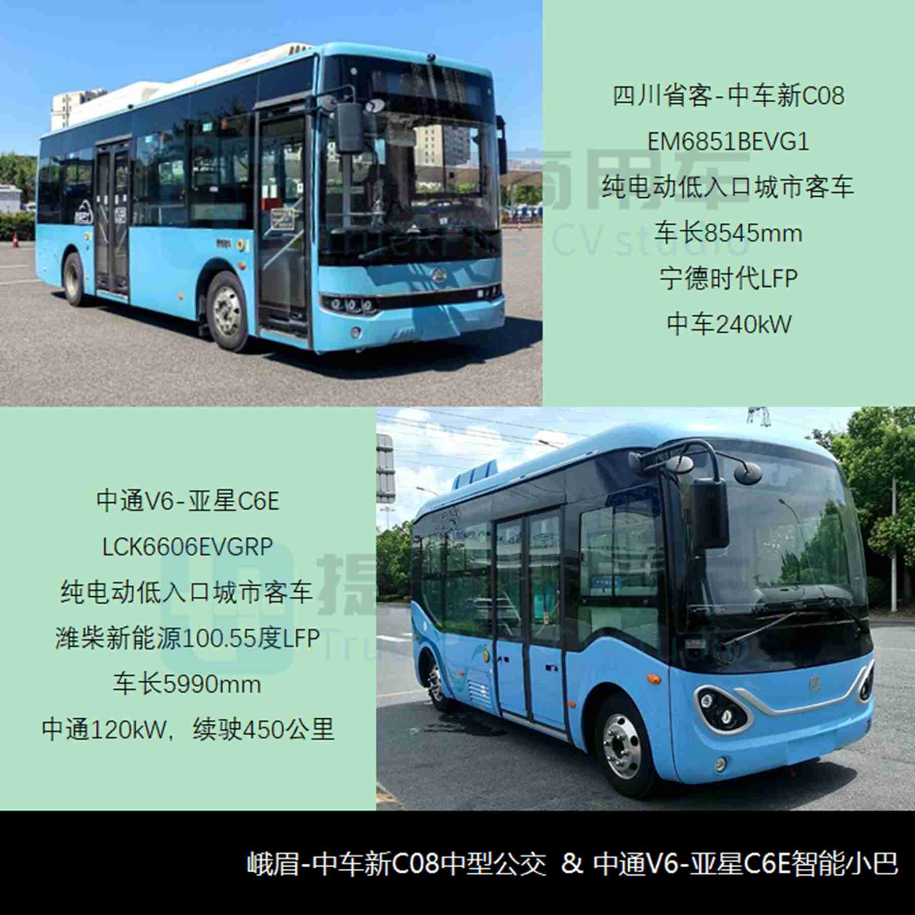 - 6月21日,四川绿然旗下的四川省客与成都中车时代签订合作协议,约定在大邑县联合打造具备年产2000辆新能源商用车产线的绿色产业园区,至此形成“川客峨眉-中车电动”联合体。本批四川省客利用中车新C08产品资源,申报了EM6851BEVG1纯电动低入口城市客车,采用中车TEG6853BEVC51三类底盘改制,车长8545mm、轴距4.5米,前/后空气悬挂,搭载宁德时代LFP动力电池,中车240kW电驱系统。据介绍,中车时代已累计在川销售近3千辆新能源公交、近万套电驱系统,本次与川客联手虽非重资本的跨地域收购建厂,也是对现有产能资源的再利用,同样是其“广撒网”的布局手法之一。