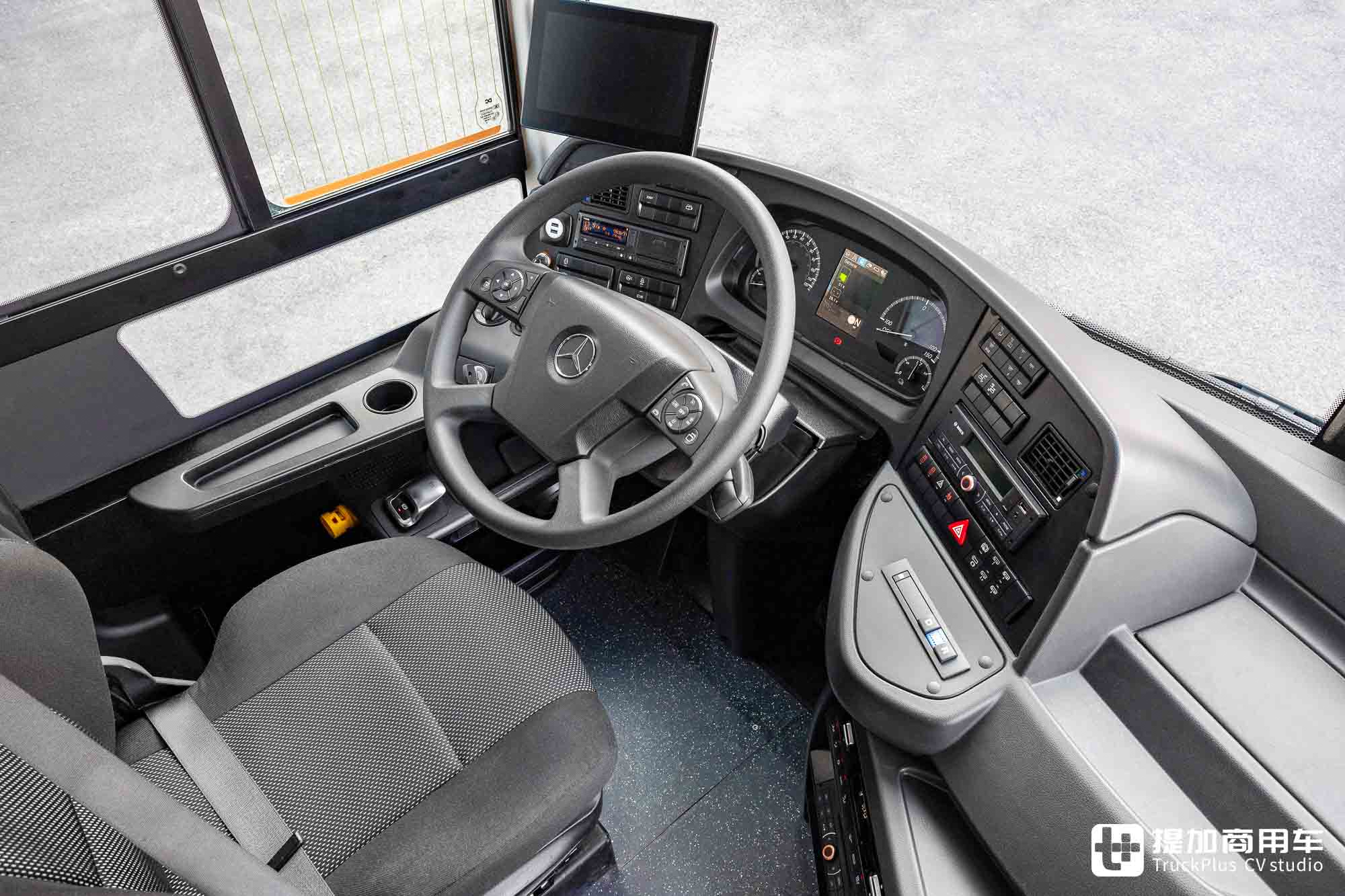 文章最后,就让我们来看看内饰吧。奔驰eIntouro纯电动城际客车的方向盘、仪表盘等操控组件均与第四代奔驰Actros系列重卡车型相同,出于零部件通用性而考虑。电子手刹、一键启动这种时髦的配置同样出现在了车辆之上。