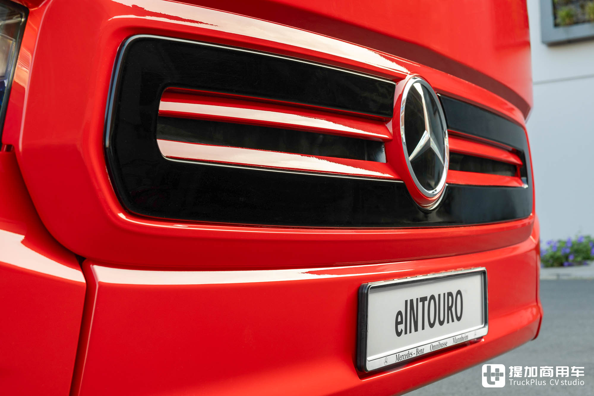 在eIntouro纯电动城际客车之上,其前面罩采用了熏黑的处理手法,而前格栅饰条则与车身同色,二者相组合降低了车辆前脸的单调感。奔驰三叉星标镶嵌于前面罩中央位置,车标周围也采用了与车身同色的勾边处理,进一步起到了强调的作用。