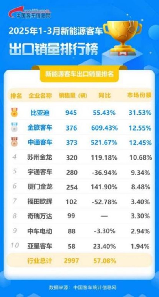 2025年1-3月份,中国新能源客车累计出口2997辆。其中,比亚迪以945辆的新能源客车出口量位居榜首,同比增长55.43%,市场份额达31.53%,以绝对优势领先行业。