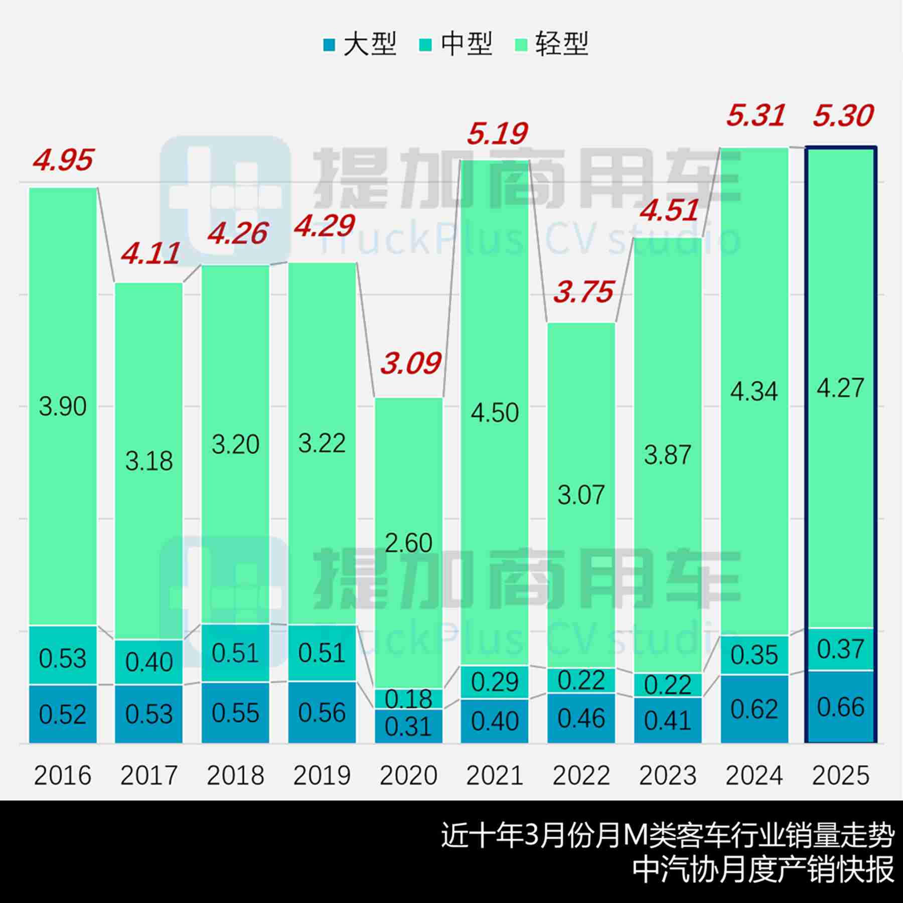 根据中汽协月度产销快报,2025年3月份M类客车市场销售53028辆,环比快速增长55.18%、顺利摆脱春节假期的低谷效应,同比虽然微降0.07%,但结合近十年的3月份表现可知,这也是“唯三”突破5万辆的单月销量,大盘依然保持较好水平。具体看: