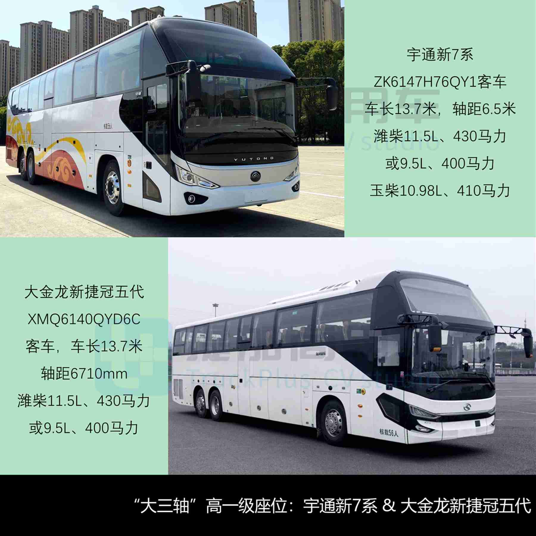 - 宇通申报了新7系的ZK6147H76QY1客车,仅有空调版车高3695mm双风挡规格,轴距6.5米较“小三轴”的6.15米有所增加、与整车长比值47.4%,侧围可选两种Y字型半幅飘带,额载24-56座,匹配潍柴11.5L、430马力或9.5L、400马力,以及玉柴10.98L、410马力柴油机,油耗22.0L/100km。