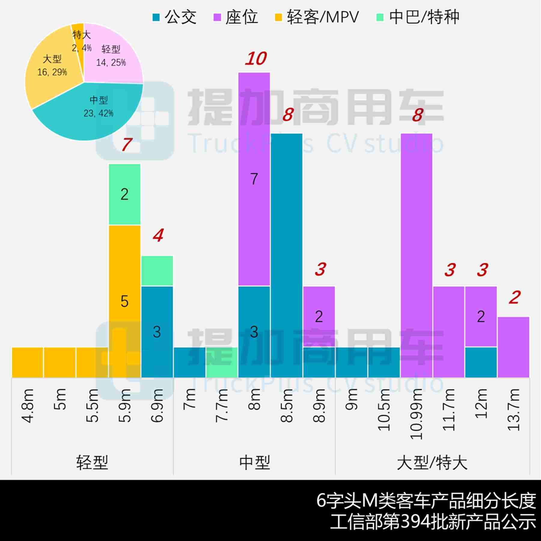 - 公交类合计19款、占比34.5%,其中:中型公交13款延续热度,常规轴距和“零后悬”比例7:6大致持平,二者开始齐头并进,而后者正随着市场端的尝鲜也开始有越来越多的出镜率,并出现了行业最大的9米新品;大型与轻型公交均为三款,在客流重塑时期开始作为特色车型而“分头行动”。