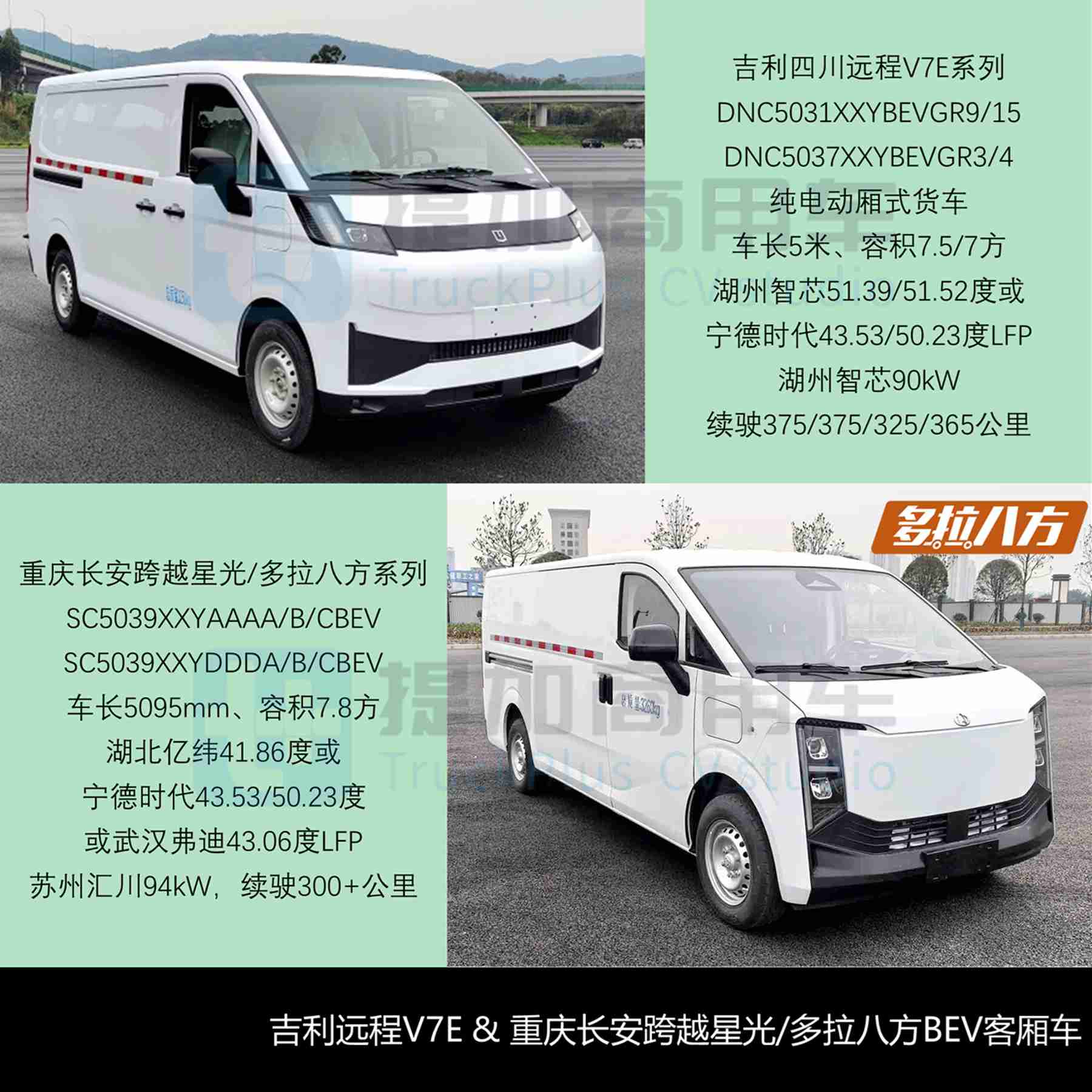 - 吉利四川远程申报了最新一代BEV客厢车——V7E系列,包括DNC5031XXYBEVGR9/15和DNC5037XXYBEVGR3/4四款纯电动厢式货车,采用全新外观,L型新款前大灯与前围熏黑覆盖件衔接,对开式尾门上有凸式加强带与纵列组合尾灯衔接。该系列车长5米、轴距3205mm,仅有1985mm低顶车高规格,GVW=3250kg,前独立、后1+1片板簧悬挂,可选左/右两侧滑移门,后单胎驱动、195号轮胎,厢长2.87米、容积7.5/7立方米,额载1375-1510kg八组规格,搭载湖北/惠州亿纬或合肥国轩单体、湖州智芯成组51.39或51.52度,以及宁德时代43.53/50.23度LFP动力电池,湖州智芯90kW驱动系统,续驶对应375/375/325/365公里。该系列可选“地上铁G50”尾标,可知货运平台这股潜在的造车势力也开始流行。