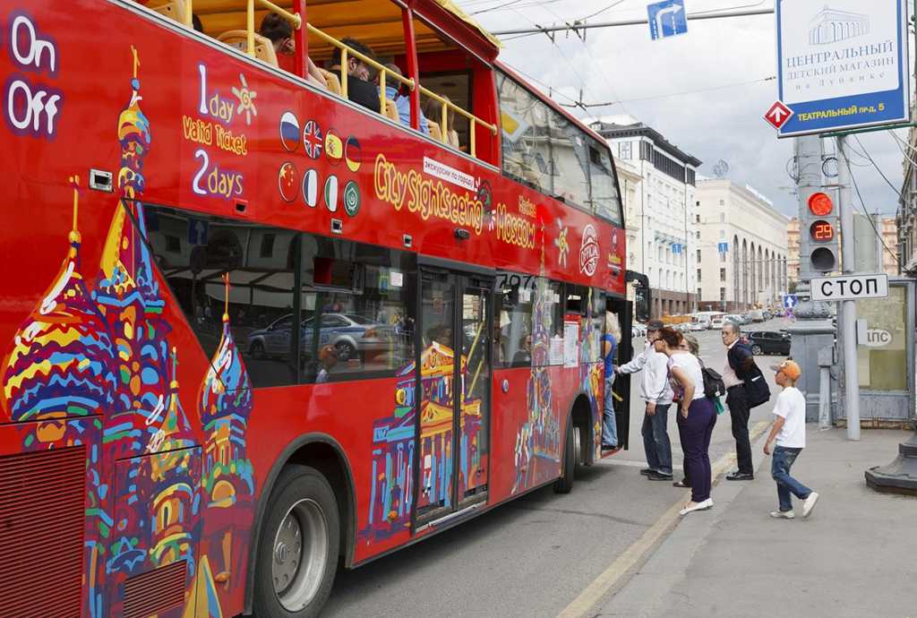 俄罗斯世界杯期间乘客乘坐海格双层巴士