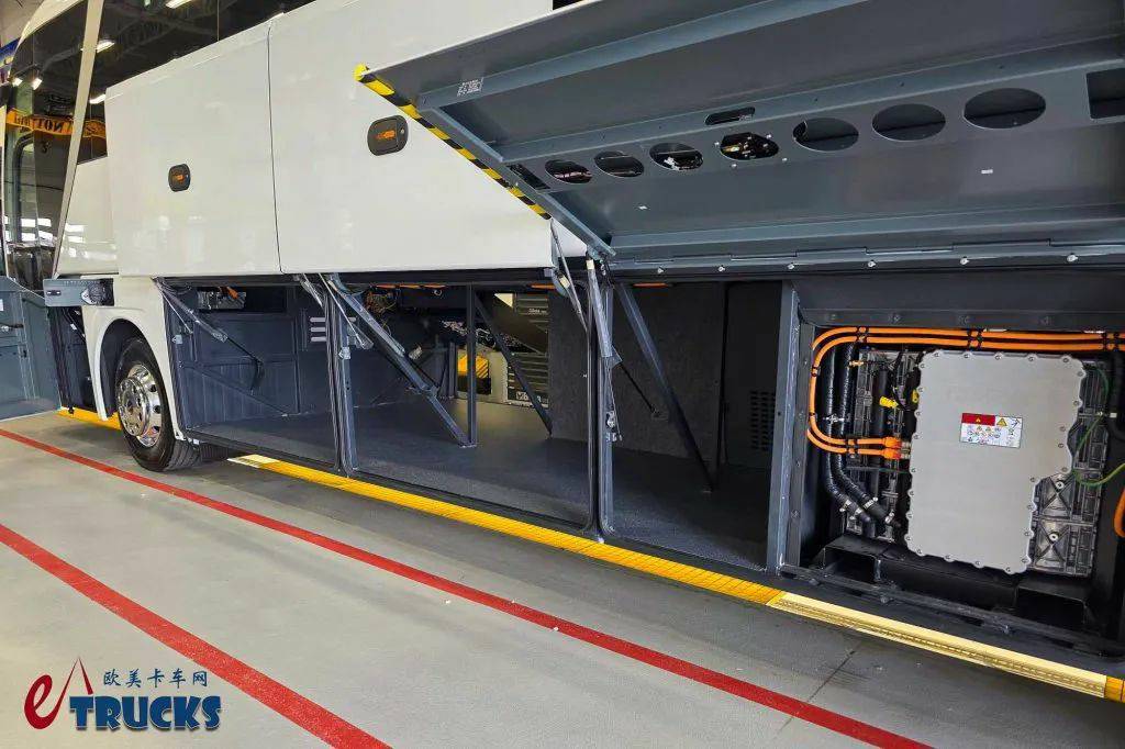原车尾发动机舱区域安装四组电池,其余两组则需要“牺牲”车身侧面的驾驶员睡眠舱空间