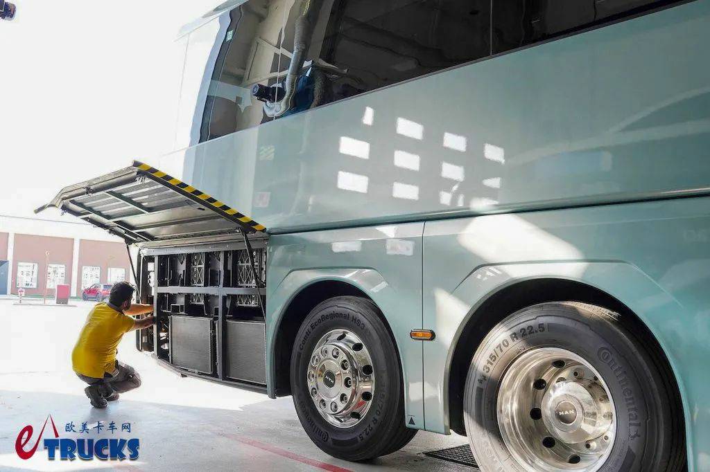 曼恩Lion’s Coach采用后置发动机设计。在电气化改造后,车辆原有的柴油发动机消失,对应的空间用于安装电池组。曼恩Lion’s Coach 14 E纯电动大巴可选4组到6组电池,单组电池电量89kWh,最大装车容量534kWh。根据曼恩数据,这套五百多度的电池能为车辆带来650公里的续航里程,对于其主打的中短途客运而言,如此的续航已经非常够用了。