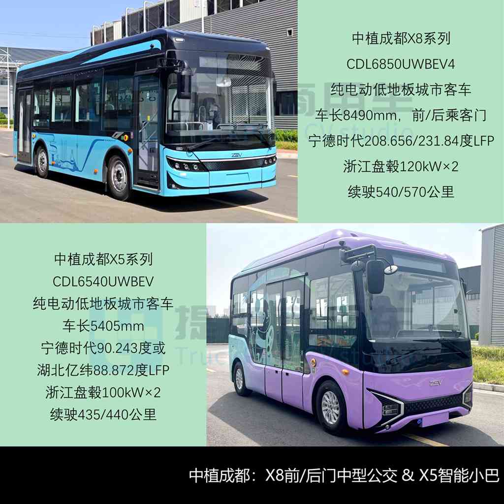- 首款为中植成都X8系列CDL6850UWBEV4纯电动低地板城市客车,基础车长8490mm、宽2.55米达到外廓上限,采用4.1米常规轴距、前/后乘客门“地铁巴士BMT”布局,额载70/74/78人、14-19/22/24座,后单胎驱动、前/后275号或后355号轮胎,搭载宁德时代208.656/231.84度LFP动力电池,浙江盘毂120kW×2双轮边驱动系统,续驶540/570公里。该新品采用全新造型:简易小圆灯+异色灯板构成前/后大灯,前围的三块可开中板用银色镀铬装饰条贯穿衔接,满天星式封闭前中网配合下方黑区+雾灯区、与后尾造型呼应,值得一提的是前门后方的侧围腰线处有小幅“飘带”、类似厦门金旅川流系列的风格。