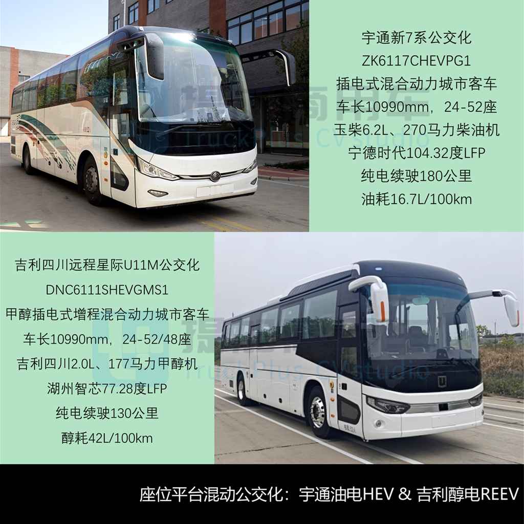 - 首款为宇通新7系的公交化新品ZK6117CHEVPG1插电式混合动力城市客车,车长10990mm、基础车高3445mm可归为中车身规格,额载24-52座、未设置站立区,采用柴油/电混合动力方案,轴距5550mm,匹配玉柴6.2L、270马力柴油机,搭载宁德时代104.32度LFP动力电池,纯电续驶180公里,油耗16.7L/100km。此前宇通采用模块化合装平台的ZK6116CHEVPG61插电式混合动力城市客车亦为同类操作,变化处为原版搭载盟固利30.134度LMO动力电池,纯电续驶51公里,而本次新品可视为统一“大平台”的混动配置细化版。