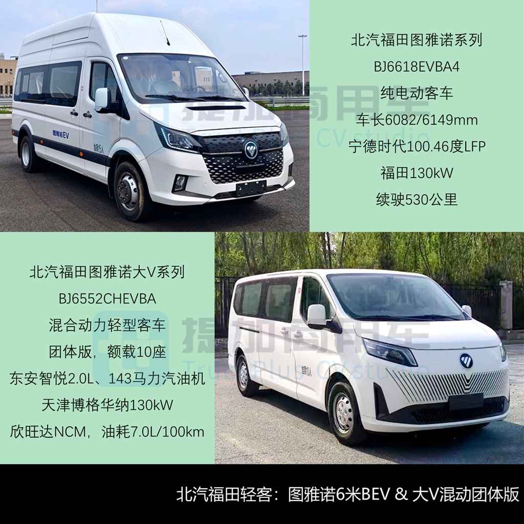 - 另款为图雅诺大V系列BJ6552CHEVBA混合动力轻型客车,本批按照非营运性质申报公告,对应上市时“油电增插混”多技术路线和“厢货/多功能/客车”多类别的规划思路——在行业扎堆聚焦BEV客厢式物流车的时代,图雅诺大V的产品线布局不吝为一股清流,非常值得从业者的高度关注。本次申报的团体版新品对应4月初发布的大V-X5系列,主体规格沿用营运版M1类规格,额载调整为M2类轻型客车的10座,整备质量固定为2230kg,油耗进一步降低为7.0L/100km,而有需求和购置条件的“小团体”用户不妨尝试。