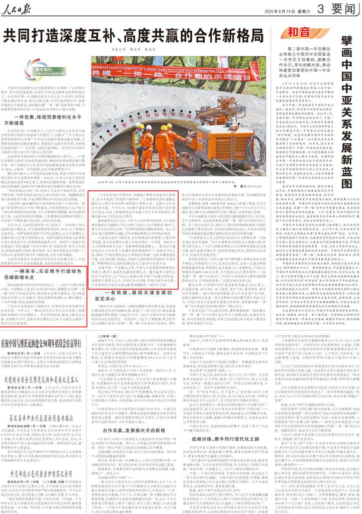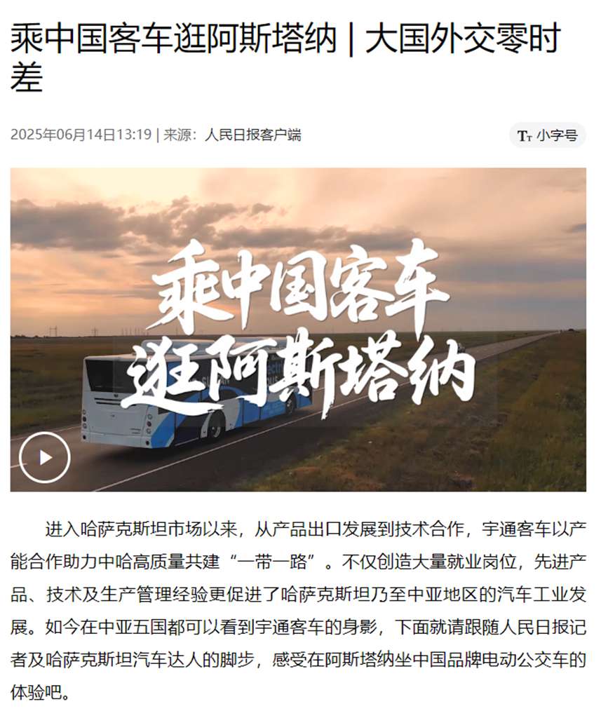 6月14日,《人民日报》再次发布重要文章,本次话题聚焦中国中亚深度互补、高度共赢的合作新格局。其中以《一辆客车,见证携手打造绿色低碳新增长点》为题重点讲述了宇通在中国中亚绿色创新合作中的重要贡献。