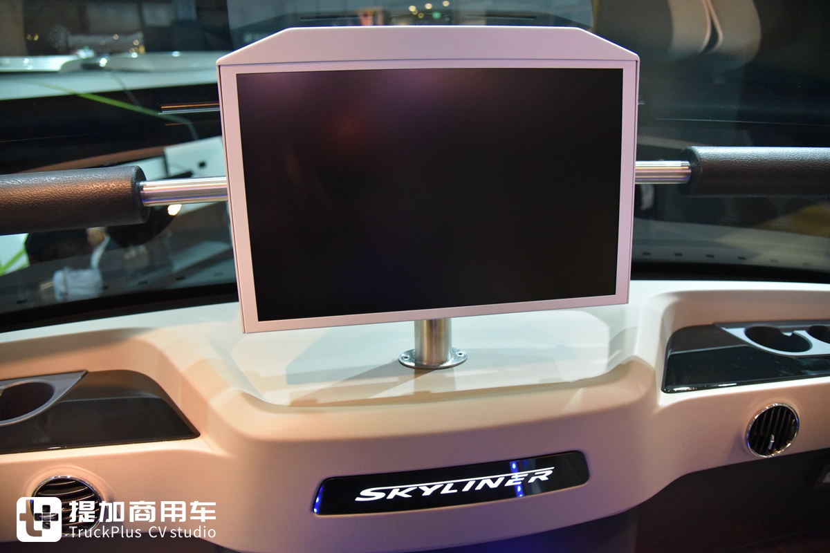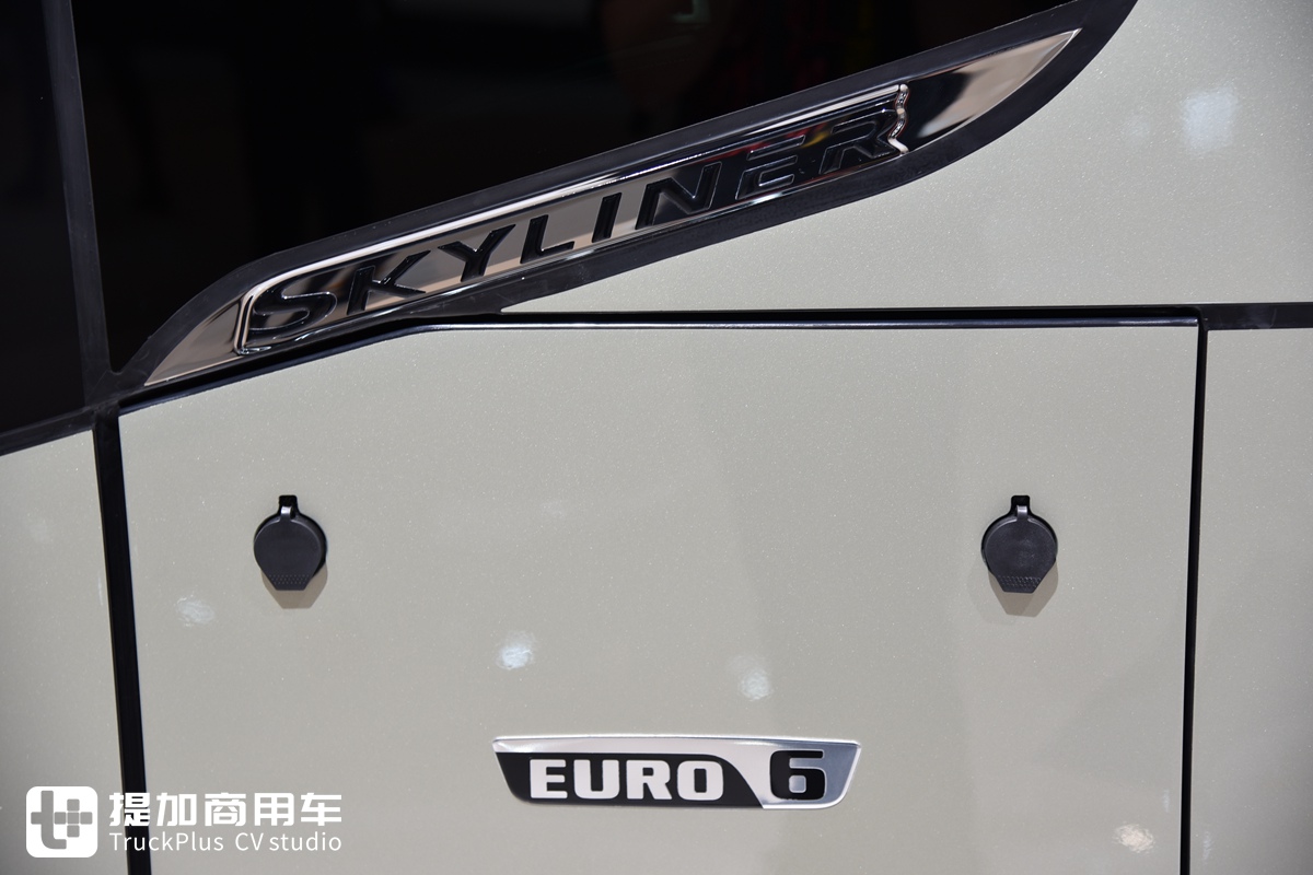 除了车身带有Skyliner标识,从大灯延伸至驾驶舱位置的线条末端带有象征意义的镀铬字母造型。Euro 6标识可以肯定该车型,已经满足欧洲当下最严苛的尾气排放标准。