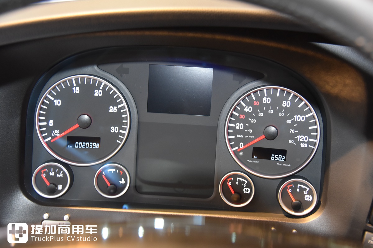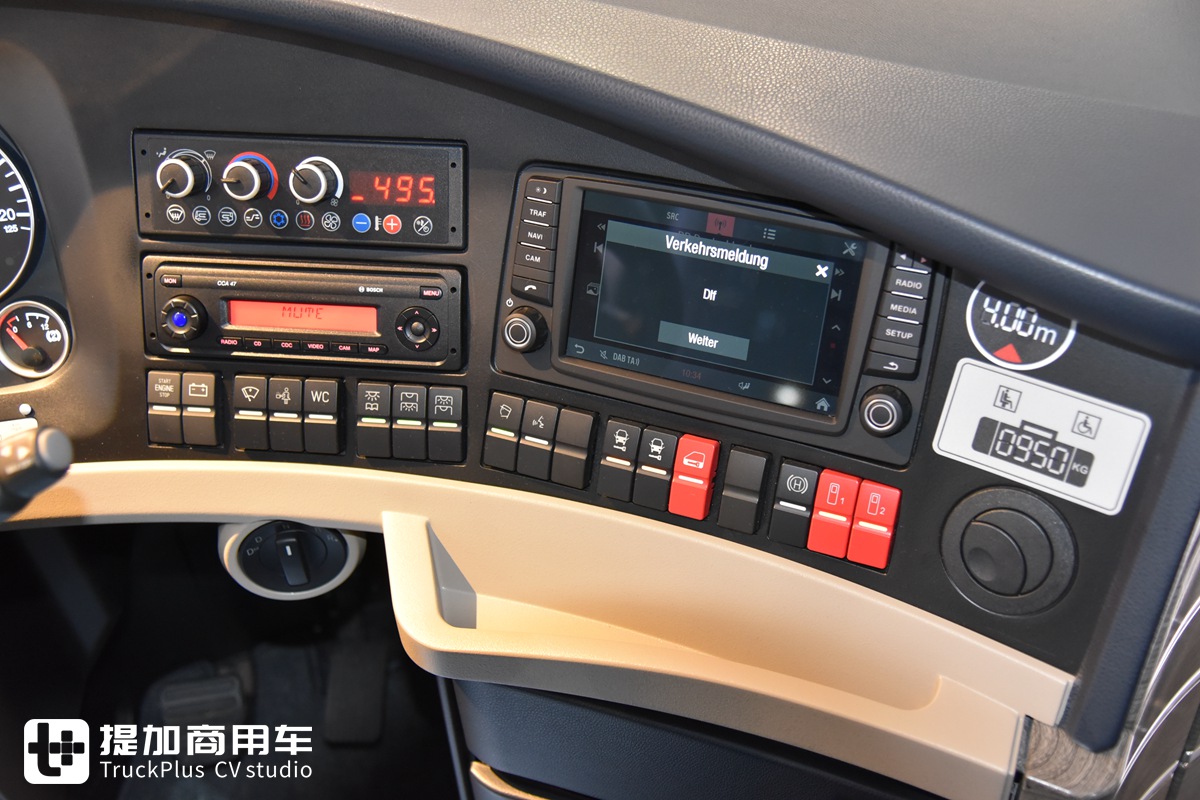 除了仪表盘与TGX/S系列重型卡车相同外,旋钮式档位开关也功能一致。其装配同款Tipmatic 12速手自一体变速器,液力缓速器控制开关布置在方向盘下方右侧拨杆处。