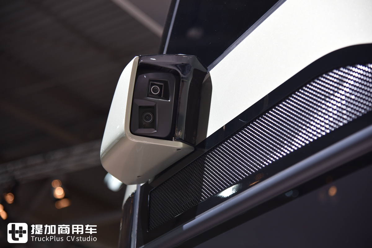 前脸中部的银色方块为毫米波雷达,同时上方风挡玻璃内侧中部位置带有主动安全摄像头。目前国产品牌客车根据客户需要,也可以选装这一主动安全配置,但多数配置于出口车型之中,国内客户受价格因素的影响并不是特别喜欢这种配置。